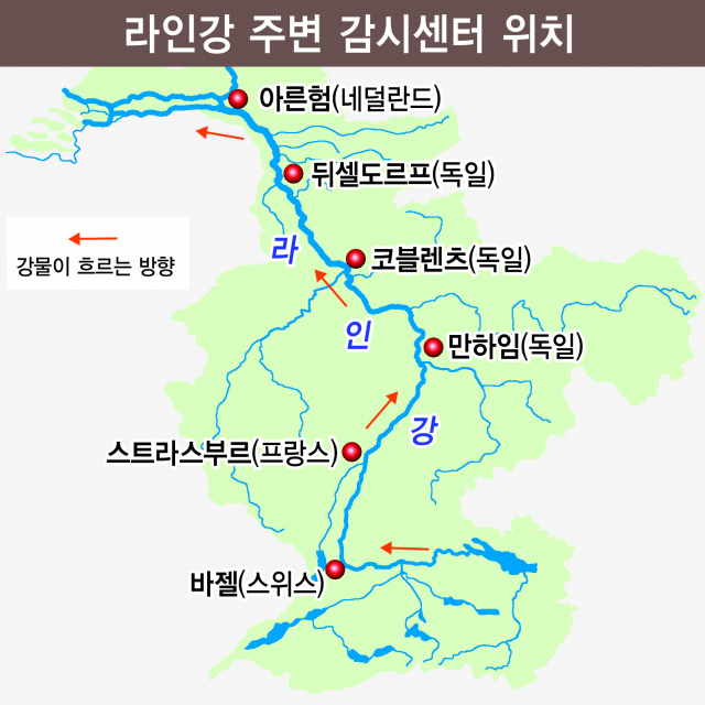 네덜란드는 아른험, 독일은 뒤셀도르프와 코블렌츠, 만하임, 프랑스는 스트라스부르, 스위스는 바젤에 감시센터를 운영하고 있으며, 직원들이 상시적으로 강 상태를 살펴보고 있다. 특히 각 국가 감시센터로 연결된 24시간 핫라인을 통해 실시간으로 정보를 공유하고 있는 체계도 구축된 상태다. 실제 네덜란드 암스테르담 시민 120만 명에게 매년 9000만t의 수돗물을 공급하는 ‘워터넷 정수장’도 과거 독일에서 경고를 발령해 취수를 중단한 사례가 있다.