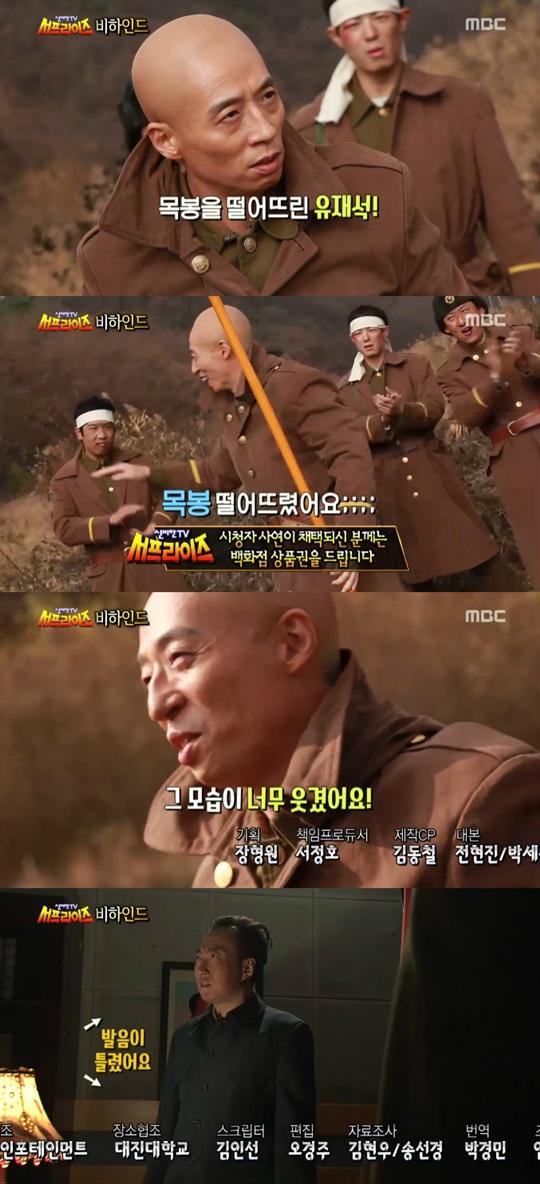 이날 유재석은 특수장교로 분해 화려한 목봉술을 선보였다. 하지만 공개된 NG장면에서 유재석은 목봉을 열심히 돌리다가 떨어트렸고, 이에 다른 출연진들은 박수를 쳤다.