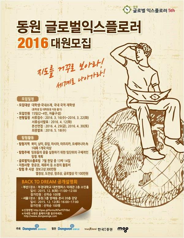 [비에스투데이 김정덕 객원기자] 동원육영재단이 대학생 해외탐험 프로그램인 ‘2016 동원 글로벌 익스플로러(Global Explorer)’에 참가할 대원을 모집한다.