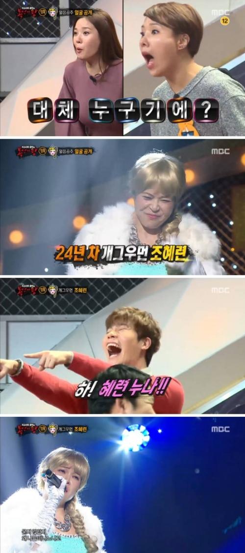 이날 산울림의 '회상'을 부르며 복면을 벗은 얼음공주의 정체는 24년차 개그우먼 조혜련이였다.