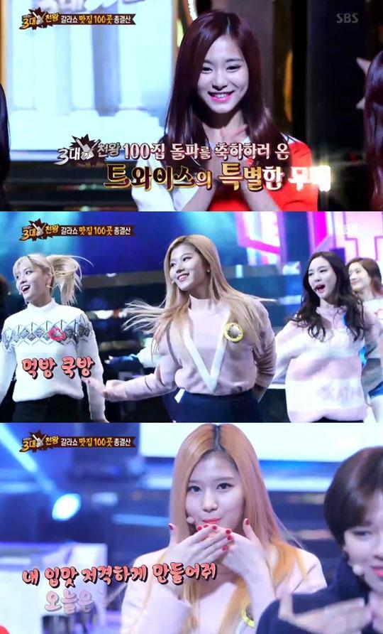 [비에스투데이 유은영 기자] 그룹 트와이스가 SBS 예능프로그램 '백종원의 3대 천왕(이하 '3대 천왕')'에서 맛집 100곳 총결산을 축하 하는 무대를 꾸몄다.