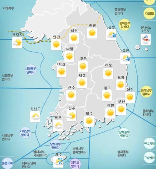 아침 최저기온은 영하 14도에서 영하 1도, 낮 최고기온은 2도에서 7도가 되겠다. 낮부터 남서풍이 유입되면서 추위는 점차 풀리겠다.
