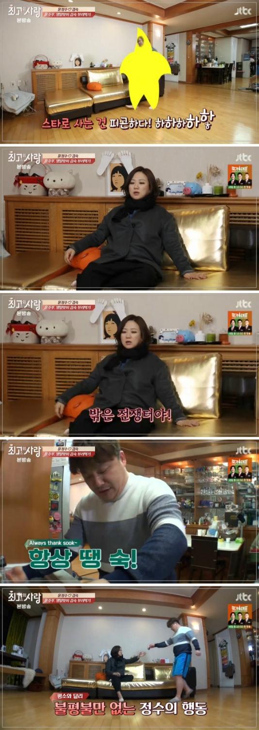 김숙은 "이거 컵에 따라 와봐"라고 말했고 윤정수는 "이 정도는 다 해 줄 수 있다"면서 말없이 김숙을 챙겼다.