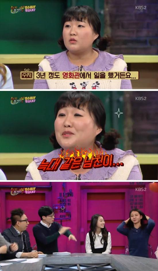 KBS2 '해피투게더3'에 출연한 이수지가 영화관 아르바이트를 하던 시절의 에피소드를 공개했다.