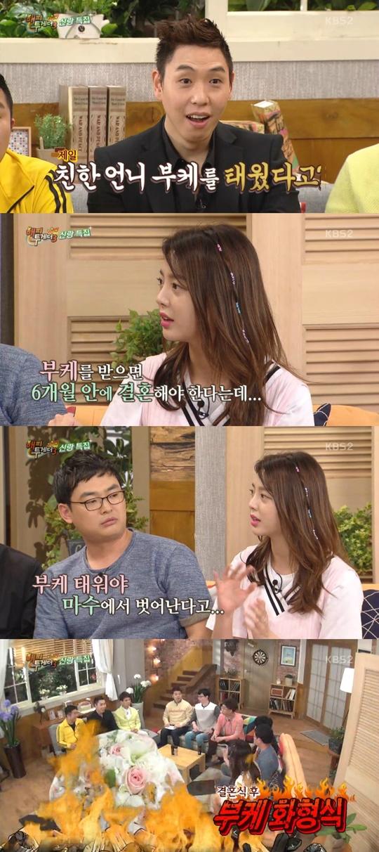 배우 엄현경이 KBS2 예능프로그램 '해피투게더3'에서 부케를 태운 적이 있다고 밝혔다.