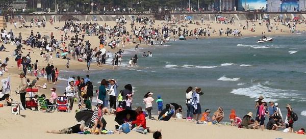 전국적으로 한여름 같은 날씨를 보인 22일 오후 부산 해운대해수욕장을 찾은 시민과 관광객들이 물놀이를 즐기며 더위를 식히고 있다. 김경현 기자 view@