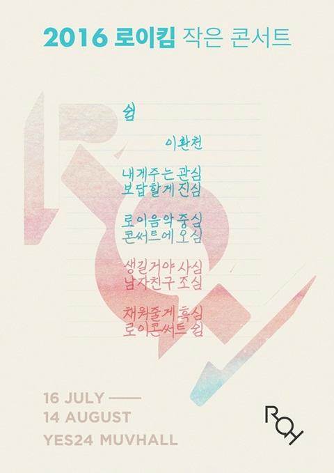 '2016 로이킴 작은 콘서트 [쉼]'은 7월 16일부터 8월 13일까지 4주간 매주 토, 일 총 8회에 걸쳐 예스24무브홀에서 진행된다. 회당 300여명의 팬들과 함께하는 소극장 콘서트로, 티켓 오픈 5분 만에 전석 매진됐다.