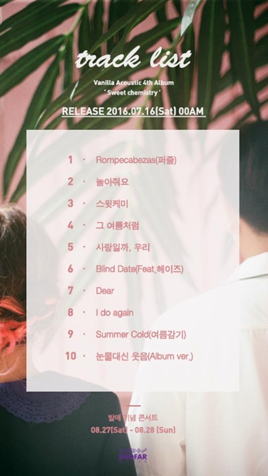 6일 바닐라어쿠스틱은 모두 10곡으로 구성된 '스위트 케미스트리'의 트랙리스트를 공개했다.