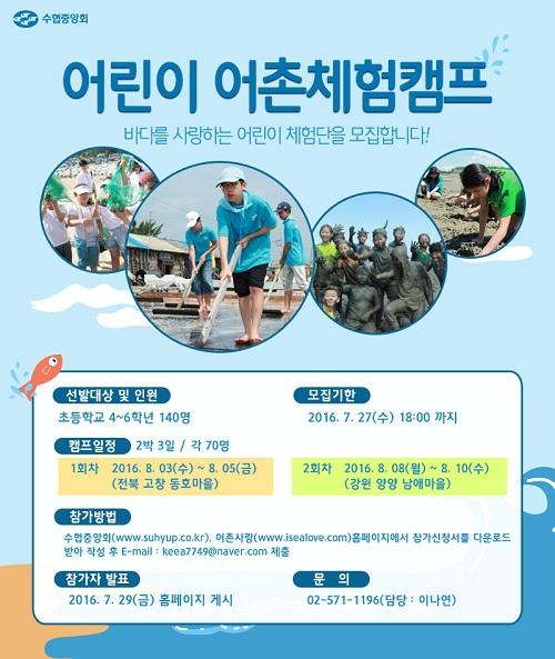 캠프 참여를 원하는 사람은 수협중앙회나 어촌사랑(www.isealove.com) 홈페이지에서 참가신청서를 다운로드 받아 오는 27일 오후 6시까지 이메일(keea7749@naver.com)로 접수하면 된다. 서류심사를 거쳐 선발 된 140명은 70명씩 두 차례에 걸쳐 다음달 3~5일, 8~10일에 각각 2박 3일간 캠프에 참가하게 된다.
