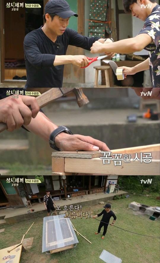 만드는 도중 유해진은 "사람들이 방송을 보고 다들 '어떻게 그렇게 뚝딱뚝딱 잘만드냐'고 묻는다"며 "이건 빨리감기를 해서 그런거다"며 설비부만의 고충을 토로했다.