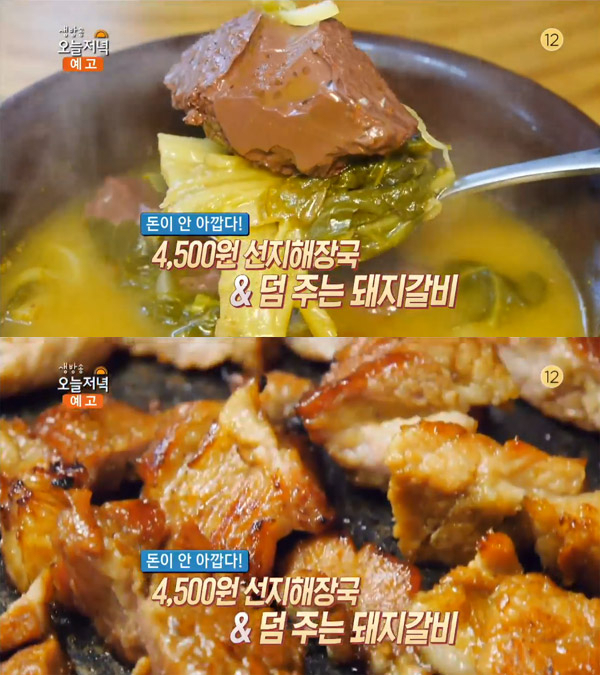 12일 방송된 MBC '생방송 오늘 저녁'에서는 '돈이 안 아깝다!' 코너를 통해 '4500원 무한리필 선지해장국& 돼지갈비 먹으면 매운 갈비찜이 공짜!' 편이 소개됐다.