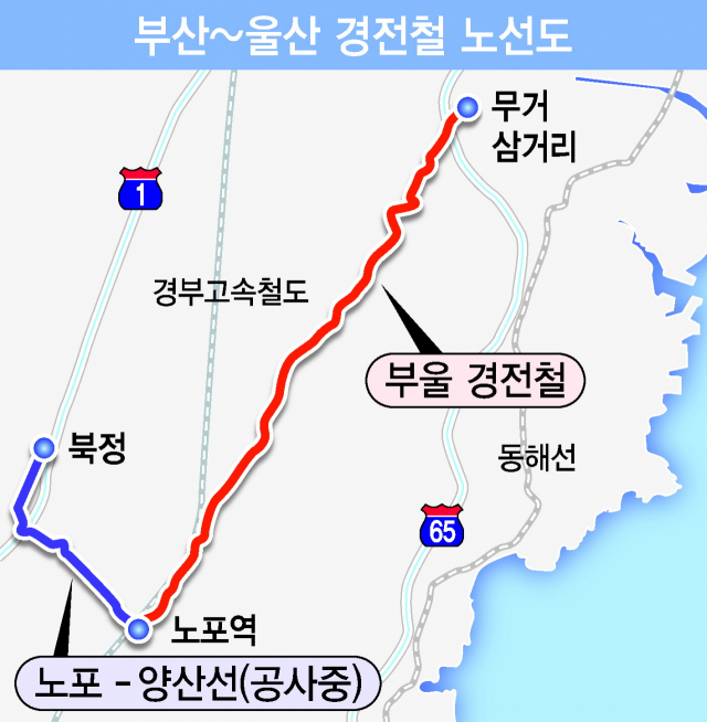 양산시는 부산도시철도 1호선 종점인 부산 금정구 노포동~양산 덕계·용당동~울산 남구 무거동을 잇는 광역철도에 대한 예비타당성 기초조사 용역(이하 용역)을 다음 달 중에 발주한다고 5일 밝혔다. 이 노선에 대한 용역은 2011년에 이어 두 번째다.