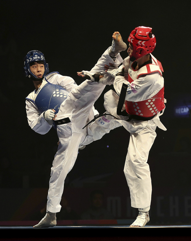 15일(현지시간) 영국 맨체스터에서 열린 2019 세계태권도연맹(WT) 세계선수권대회에 출전한 남자 58㎏급 장준(왼쪽)이 아르헨티나 루카스 구스만과 준결승 경기를 치르고 있다. 장준은 14-3으로 승리해 결승에 진출했다. AP연합뉴스