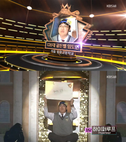 46번 베스트팔렌 조약, 47번 윤관, 48번 하인리히 법칙, 49번 '골디락스'까지 차분하게 통과한 임도연 학생은 "현재 많은 나라와 기업에서는 대중교통의 혁신을 일으킬 차세대 이동수단으로 '이것'을 손꼽고 있다. 이것은 2013년 미국의 엔지니어 출신 기업가인 엘론 머스크가 제시한 것으로 공기 마찰이 없는 진공 튜브를 시속 1300km 캡슐형 열차가 미끄러지듯 달리는 이동수단이다. 초고속 운송열차로 '꿈의 이동수단'이라 불리는 이것은 무엇이냐"는 마지막 문제에도 '하이퍼루프'를 적어 정답을 맞추며 126대 골든벨에 등극했다.