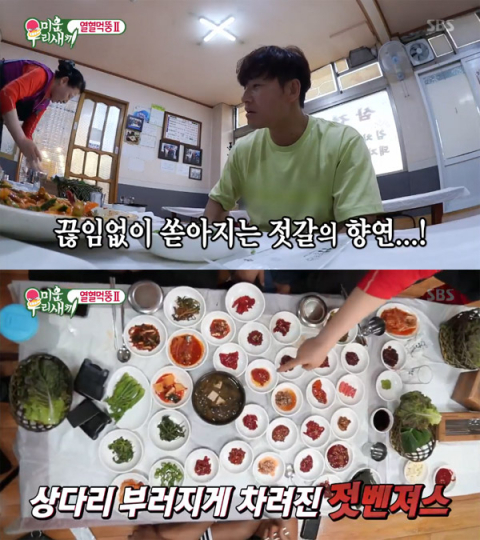 그리고 이날 방송에서 뚱브라더스는 '젓갈백반 정식' 메뉴를 주문했는데, 끊임없이 쏟아지는 20여 가지의 젓갈의 등장에 모두들 감탄했다. 여기에 된장국과 함께 각종 나물에 밑반찬까지 쏟아져 나왔고, 뚱브라더스와 김종국은 상다리 부러지게 차려진 한 상 차림에 '젓벤져스'라며 리필까지 된다는 사장님의 설명에 놀라움을 자아냈다.