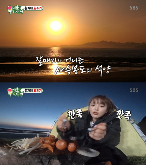 이어 저녁 식사 고민을 하던 홍진영은 '돌구이'를 하겠다며 언니를 데리고 움직였다. 홍선영의 불만이 쏟아지며 자매가 투닥투닥 다투는 가운데, 홍진영은 "맛있는 냄새가 나도 언니 입으로 들어갈 음식은 없어"라고 단호하게 선을 그었다. 한참의 시간이 걸려 마침내 홍진영은 두꺼운 돌을 발견해 텐트로 가져왔다. 홍진영은 두꺼운 돌을 불판 삼아 캠핑 요리를 시작했다. 하지만 시간이 흘러도 돌은 달궈질 기미가 보이지 않았고 홍선영은 "너 혹시 내일 아침 식사를 준비하는 거냐"며 놀렸다. 하지만 홍진영의 오랜 기다림에 돌이 어느 정도 달궈지기 시작했고, 홍진영은 소시지, 닭발, 버섯 등 갖은 재료를 올려 맛있는 캠핑 요리를 시작했다.