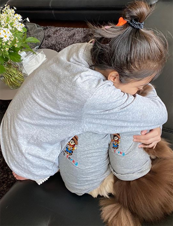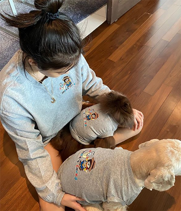 공개된 사진 속에는 똑같은 회색 티를 입고 있는 제니와 반려견 카이, 쿠마의 모습이 담겨있다. 제니는 반려견이 사랑스러운 듯 꼭 껴안으며 애정을 과시했다.