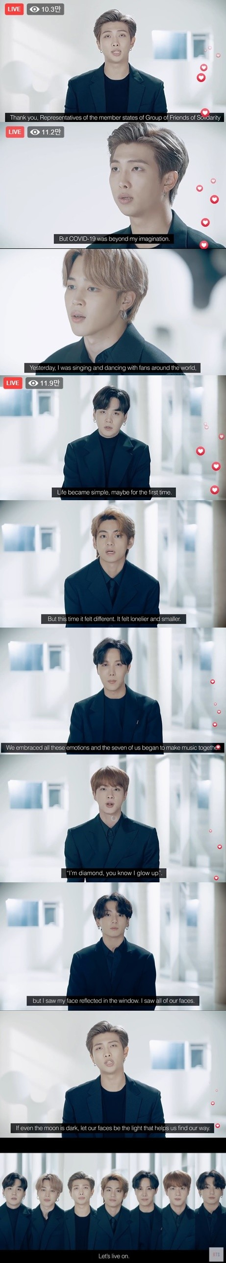 끝으로 RM은 "지금이야말로 우리가 스스로의 얼굴을 잊지 않고, 마주해야 하는 때"라며 "필사적으로 자신을 사랑하고 미래를 상상하려고 노력했으면 한다. 방탄소년단이 함께 하겠다"고 강조했다.