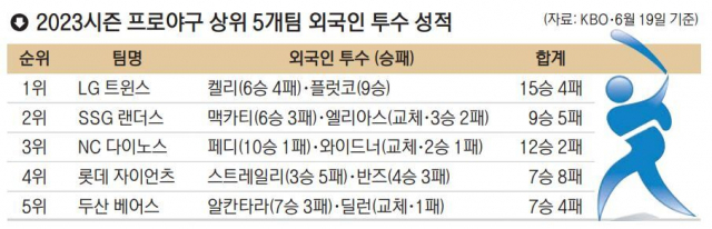 상위 5팀 중 외국인 투수의 성적이 가장 좋은 팀은 1위 LG 트윈스다. LG는 플럿코(9승)와 켈리(6승 4패)가 합작한 승수가 15승에 달한다. 롯데 두 투수보다 배 이상 많은 승수다. 2위 SSG는 맥카티와 엘리아스가 각각 6승 3패와 3승 2패를 거두고 있다.