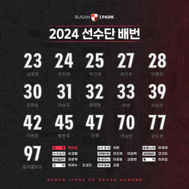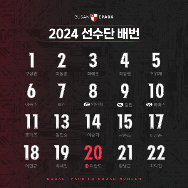 한편, 부산은 올 시즌 선수단 배번도 함께 공개했다. 주장 이한도는 프로 내내 함께했던 20번을 올해도 달았고, 부주장 김찬과 라마스도 작년과 같은 9번·10번을 받았다. 구상민(1번)·조위제(5번)·페신(7번)·성호영(23번)·천지현(24번)·원태랑(32번)·황준호(45번) 등도 지난해와 같은 등번호를 달았다.