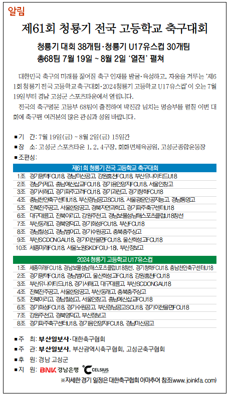 대한민국 축구의 미래를 짊어질 축구 인재를 발굴·육성하고, 자웅을 겨루는 ‘제61회 청룡기 전국 고등학교 축구대회·2024청룡기 고등학교 U17유스컵’이 오는 7월 19일부터 경남 고성군 스포츠타운에서 열립니다.