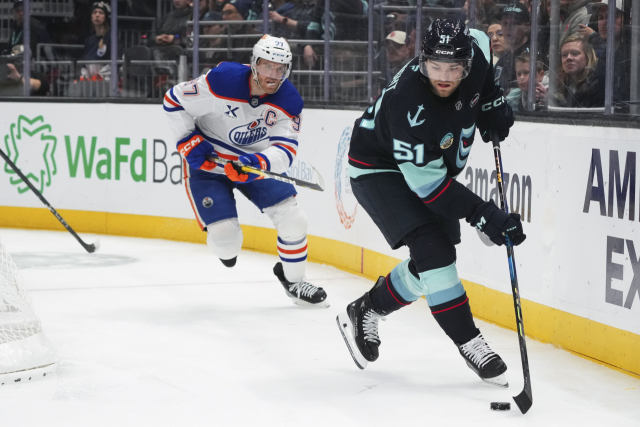 시애틀 크라켄의 센터 셰인 라이트(오른쪽)가 5일(한국시간) 미국 시애틀에서 열린 북미아이스하키리그(NHL) 2차전에서 에드먼턴 오일러스의 센터 코너 맥데이비드를 상대로 퍽을 몰고 있다. 이날 에드먼턴 오일러스가 시애틀 크라켄에 4-2로 승리했다. AP연합뉴스