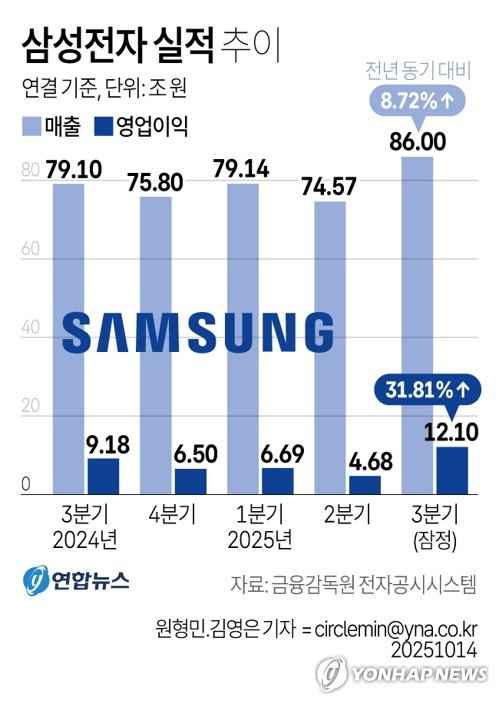 삼성전자는 14일 공시를 통해 연결 기준 올해 3분기 영업이익이 12조 1000억 원으로 지난해 동기보다 31.8% 증가한 것으로 잠정 집계됐다고 발표했다. 영업이익은 2022년 2분기(14조 1000억 원) 이후 3년여 만에 최대치를 기록한 것이다.
