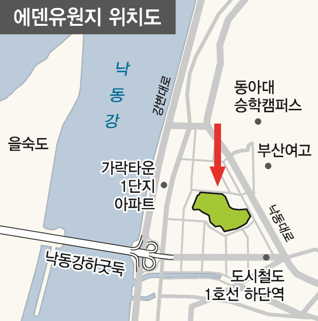 하지만 하단동 일대 개발이 진행되는 사이 에덴유원지는 관리 공백으로 40년가량 쇠락해 갔다. 문화 명소였던 에덴유원지는 최근 시민들에게 산책을 위한 체육공원 정도로 인식될 만큼 쇠퇴했다.