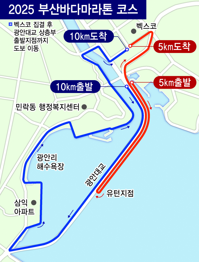 올해 부산바다마라톤은 10km 로드레이스, 5km 건강달리기로 나눠 열린다. 10km는 기록을 꿈꾸는 동호인들이 즐기는 코스다. 광안대교 입구에서 출발해 광안대교를 건너 광안리해수욕장을 거쳐 민락수변로를 따라 달려 수영로를 건넌 뒤 피니시라인으로 들어오게 된다.