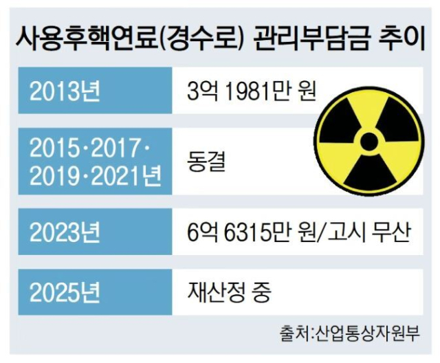 하지만 2년 전 원전 당국이 직접 산정한 결과가 알려지면서, 업계의 전망치도 재조정됐다. 2023년 방사성폐기물 관리비용 산정위원회는 부담금을 107.4% 증액한 6억 6315만 원으로 결정했으나, 후속 조치를 진행하지 않아 논란이 됐다. 뒤늦게 2023년 산정 결과가 알려지면서, 부담금을 배 가까이 올려야 한다는 공감대가 급속히 퍼졌다.