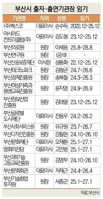 26일 부산시에 따르면 부산시 17개 출자·출연기관 가운데 4개 기관의 기관장 임기가 끝났거나 오는 12월 종료된다. 신현석 전 원장이 지난 8월 말 퇴임한 이후 공석인 부산연구원과 기관장 임기가 12월 만료되는 부산신용보증재단과 벡스코, 아시아드컨트리클럽(아시아드CC)이다.