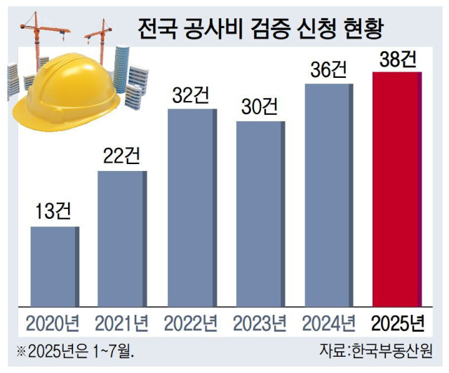 국회 국토위 소속 안태준 더불어민주당 의원이 한국부동산원에서 제출받은 자료에 따르면 전국 정비사업장에서의 공사비 증액 검증 요청은 2020년 13건에서 2024년 36건으로 4년 새 3배 가까이 증가했다. 올해는 지난 7월까지 38건이 이뤄져 이미 지난해 전체 건수를 넘어섰다.
