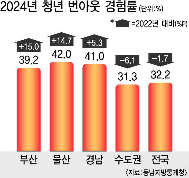 지난해 부산·울산·경남 청년 2만 1000여 명이 타 지역으로 유출됐다. 불탄 연료처럼 피로감이나 무기력증을 느끼는 ‘번아웃’을 경험했다고 답한 부울경 청년 비율은 2년 전보다 크게 늘었고, 전국과 비교했을 때도 높았다. 번아웃 이유로는 진로 불안이 압도적이었다.