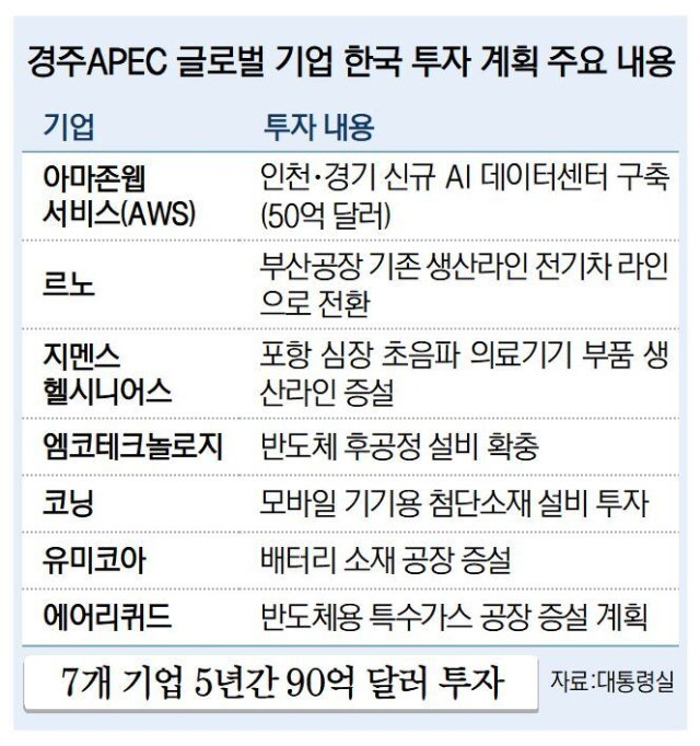 아마존웹서비스(AWS)와 르노, 지멘스 등 글로벌 기업 7곳이 한국에 향후 5년간 총 90억 달러(한화 약 13조 원) 규모로 투자하기로 했다.