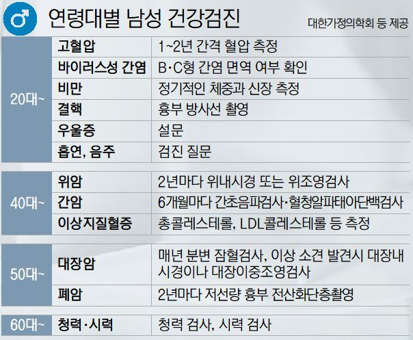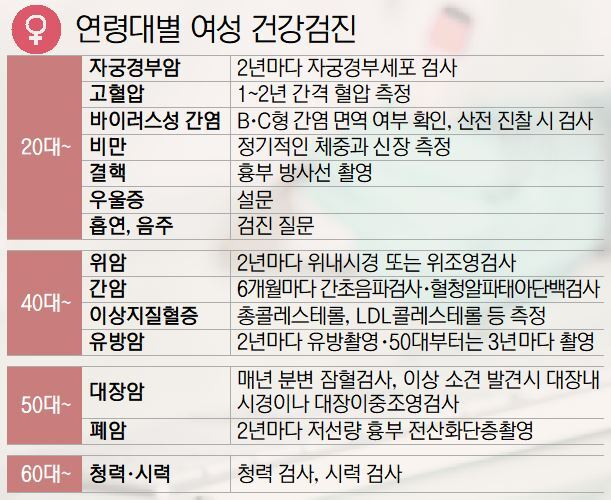 연령대별로 건강검진 항목에 차이를 보인다. 20~30대의 경우에는 2년에 한 번 정도 기본 건강검진을 받는 것으로도 충분하다. 하지만 흡연·음주 습관이 있거나 비만, 가족력이 있는 경우엔 매년 검진을 받으면 좋다. 대한가정의학회 한성호(동아대병원 가정의학과 교수) 회장은 “부모나 형제자매가 50세 이전에 암 진단을 받았다면 일반인보다 더 이른 시기에 검진을 시작하는 것이 안전하다”고 권유했다.