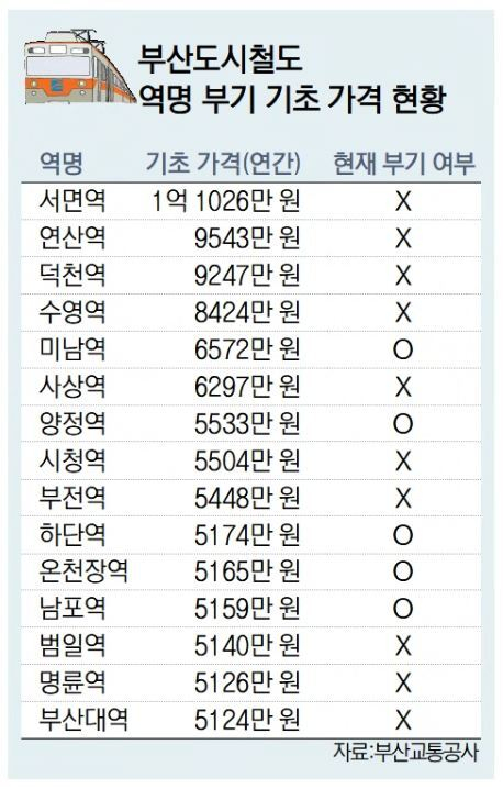 2일 부산교통공사에 따르면 공사는 지난달 30일 부산도시철도 1~4호선 92개 역을 대상으로 부기 역명 유상 판매 정기 입찰을 진행했다. 이번 입찰의 관건은 연간 기초 가격 8000만~1억 원 수준의 ‘비싼 역’을 판매하는 것이다. 판매 대상에는 서면, 연산, 전포역 등 인파가 몰리는 환승, 거점 역이 다수 포함돼 있다.