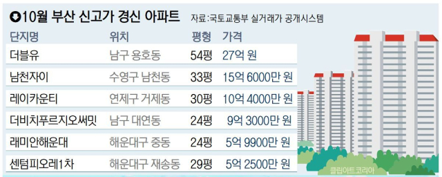 5일 국토교통부 실거래가 공개시스템에 따르면 남구 용호동 더블유 54평(전용 면적 134㎡)은 지난달 21일 27억 원에 매매 계약을 체결해 신고가를 기록했다. 불과 3개월 전인 7월 말 같은 동, 같은 면적에 층수가 오히려 높은 매물이 26억 5000만 원에 거래된 것과 비교하면 가격 상승폭이 상당히 빠른 편이다. 수영구 남천동 남천자이 33평(전용 84㎡)은 지난달 26일 15억 6000만 원에 거래되며 신고가를 경신했다. 연제구 거제동 레이카운티 30평(전용 75㎡) 역시 지난달 27일 10억 4000만 원에 매매돼 최고가를 기록했다.