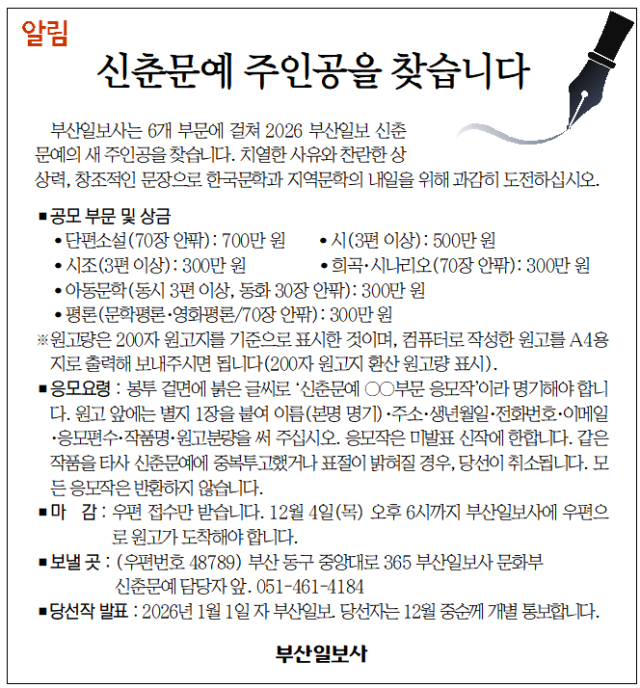 ■당선작 발표 : 2026년 1월 1일 자 부산일보. 당선자는 12월 중순께 개별 통보합니다.
