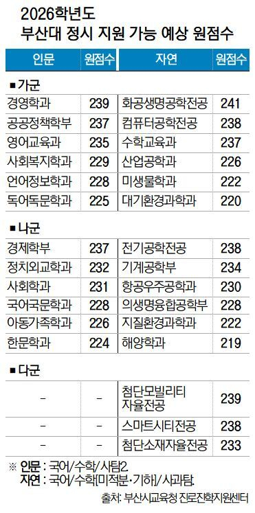 ’가’군에서 부산대 화공생명공학전공 241점, 컴퓨터공학전공 238점, 수학교육과 237점, 산업공학과 226점, 미생물학과 222점이 제시됐다. ’나’군은 전자공학전공 238점, 기계공학부 234점, 항공우주공학과 230점, 의생명융합공학부 228점, 지질환경과학과 222점 정도로 예상된다.