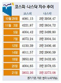 특히 국내 증시가 직격탄을 맞았다. 지난 21일 코스피는 4% 가까이 폭락하며 패닉 장세를 연출했다. 외국인은 이날 하루에만 3조 1000억 원을 순매도했는데, 이는 역대 최대 규모다. 한국거래소에 따르면 이날 코스피 지수는 151.59포인트(3.79%) 내린 3853.26으로 장을 마감했다. 지난 3일 코스피 지수가 4221.87포인트로 사상 최고치를 기록했으나 한 달도 되지 않아 3900선이 붕괴된 것이다.