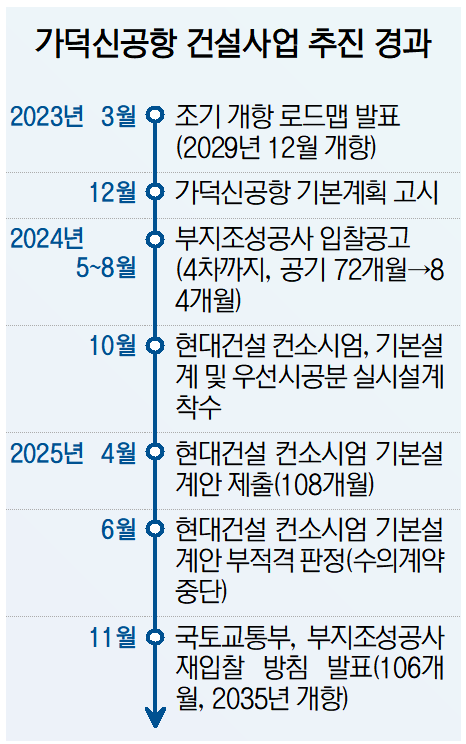 실제로 정부는 가덕신공항 건설사업을 수도권 일극 체제를 극복하고 남부권 혁신과 국가균형발전을 이끄는 핵심 국정과제로 설정하고 조기 개항과 신속한 추진에 방점을 뒀다. 이를 위해 특별법으로 예비타당성 조사를 면제하고, 개정안을 통해 보상 등 행정절차를 신속하게 추진하도록 했다. 그러나 현대건설 컨소시엄의 계약조건 위반과 정부의 늦장 행정, 무책임한 공기 연장안이 이어지면서 지난해 5월 처음 시작된 부지 조성 공사 입찰은 1년 반 동안 공전한 채 아직 시작조차 못한 상황이다.