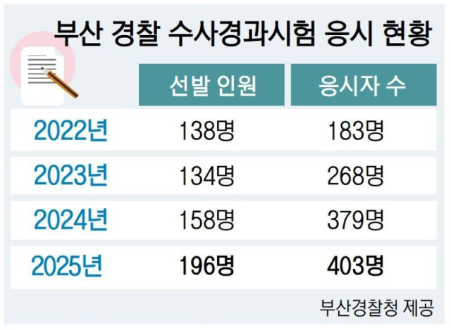 30일 부산경찰청에 따르면 올해 부산청 수사경과시험 응시자는 403명(196명 선발)으로 2022년 183명(138명 선발)에 비해 2배 이상 증가한 것으로 확인됐다.