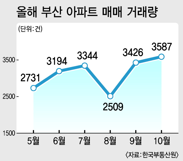 1일 한국부동산원에 따르면 지난 10월 부산의 아파트 매매 거래량은 3587건으로 집계됐다. 이는 2021년 10월(4001건) 이후 꼭 4년 만에 3500건을 상회하는 최대 수준이다.