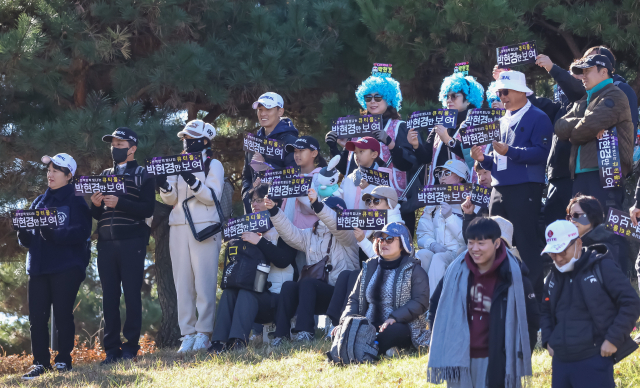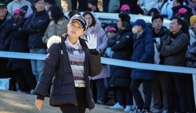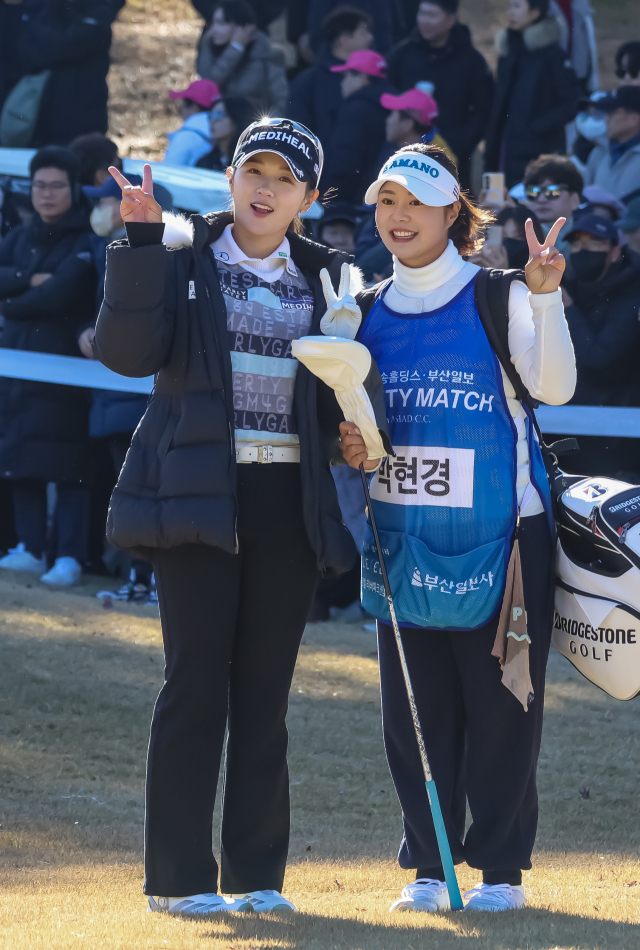 ‘2025 백송홀딩스·부산일보 채리티 매치 인 아시아드CC’가 6일 부산 기장군 아시아드CC에서 열렸다. 박현경 선수가 팬들의 응원을 받으며 1라운드를 시작했다.