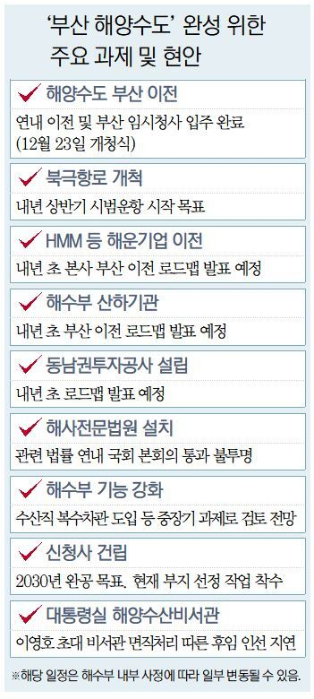 무엇보다 내년 초 구체적인 로드맵이 발표될 예정이던 HMM 본사 부산 이전, 해수부 산하기관 부산 이전, 동남권투자공사 설립 등이 가장 우선적으로 챙겨야 할 사업들이다. 최소한 해수부가 차기 리더십이 들어서기 전까지 부산 해양수도 완성을 위한 여러 현안과 과제에 대해 만반의 준비를 해야한다는 지적이다. 시민단체 한 관계자는 “노조 설득 같은 여러 정무적인 사안을 풀어나가려면 차기 해수부 장관이 하루 빨리 들어서야 한다”며 “그동안 해수부 임직원들이 흔들리지 말고 해수부 이전을 비롯한 여러 사업들에 최선을 다해야 할 것”이라고 밝혔다.