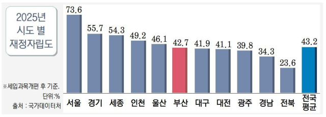 재정자립도는 재정분권의 수준을 보여주는 지표이다. 지난해 비수도권 재정자립도 수준은 역대 최저로, 처참한 지방재정 현실을 적나라하게 드러냈다. 지난해 서울 재정자립도는 73.6%, 경기도는 55.7%로 절반을 훌쩍 넘겼다. 반면 제2도시인 부산은 평균 아래인 42.7%에 그쳤다. 부산 재정자립도를 예로 들면, 전체 예산 100 중 부산시가 42.7만 스스로 벌고 나머지 57.3은 중앙정부 지원금이나 교부세 등 외부 도움으로 충당한다는 의미이다. 반면 서울과 경기 등 수도권은 절반 이상을 스스로의 힘으로 충당하고 있다. 부산을 포함한 비수도권 지역은 중앙정부 ‘주머니’만 쳐다볼 수 밖에 없는 이유다.