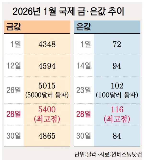 올해 들어 국제 금 가격은 연초 온스당 약 4300달러대에서 출발해 지난 26일 사상 최초로 5000달러를 넘어섰다. 이어 5400달러까지 치솟았으나 월말에는 4800달러대로 조정됐다. 국제 은 가격 역시 온스당 72달러에서 시작해 120달러대 고점을 찍은 후 84달러 선으로 하락 마감했다. 특히 지난달 30일 금과 은이 하루 만에 각각 10% 안팎, 30% 가까이 급락하는 등 변동성이 컸다. 그럼에도 금은 지난 1월 초 대비 약 12%, 은은 17%가량 상승했다.