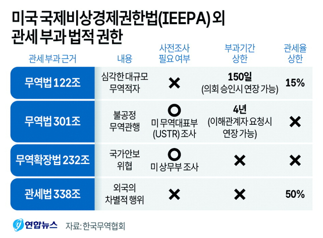 트럼프 대통령은 이 외에도 무역확장법 232조, 무역법 301조 등을 활용해 상호관세 등을 대체하겠다는 방침이다.