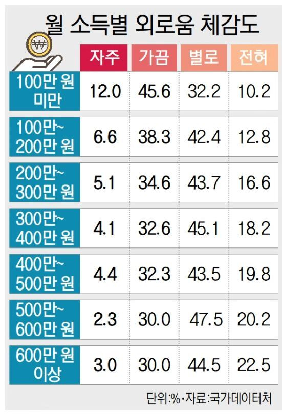 100만원 미만 가구 가운데 △12.0%는 ‘외로움을 자주 느낀다’고 답했고 △45.6%는 ‘가끔 느낀다’고 응답했다.
