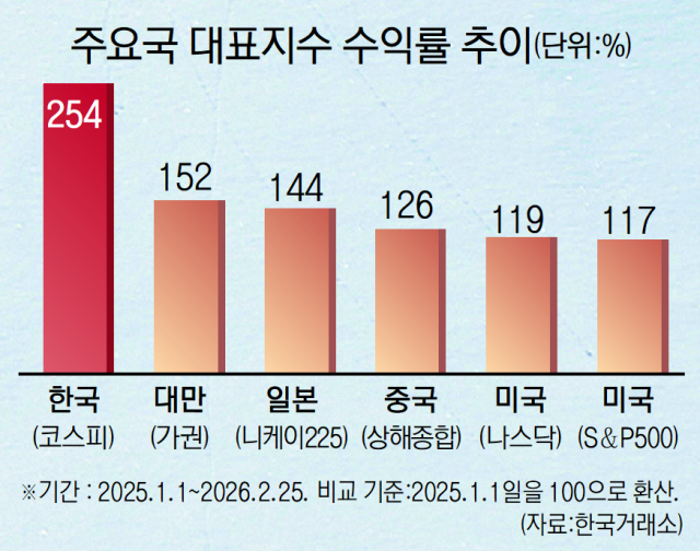 지난해 1월 1일을 100으로 환산한 주요국 대표 지수 수익률에서도 코스피는 254로, 대만(가권) 152, 일본(니케이225) 144, 중국(상해종합) 126, 미국(나스닥) 119, 미국(S&P500) 117을 크게 앞질렀다.